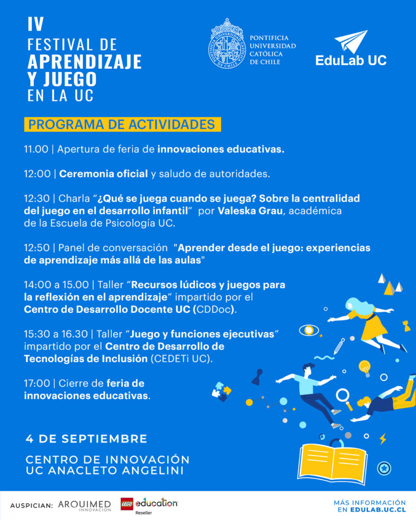 Por cuarto año consecutivo, se anuncia la realización del Festival de Juego y Aprendizaje en la UC, un evento magistral que ofrecerá una feria expositiva de innovaciones educativas provenientes de la Universidad Católica, charlas con expertos y talleres gratuitos sobre metodologías lúdicas para el aprendizaje. Un espacio de encuentro para que académicos, investigadores, estudiantes y actores del mundo educativo compartan en torno a los juegos con impacto en el aprendizaje. Evento auspiciado por LEGO® Education en Chile (Arquimed).